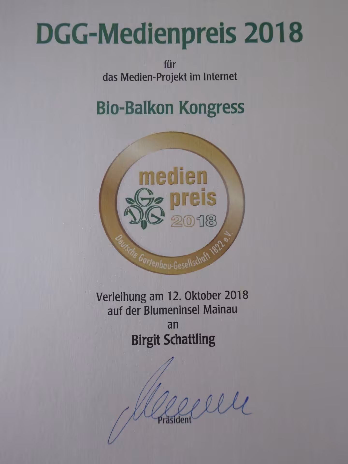 Der Deutsche Lokale Nachhaltigkeitspreis ZeitzeicheN würdigt beispielhaftes Engagement bei der Umsetzung der Agenda 2030. Der Bio-Balkon gewinnt mit 1982 Stimmen den ZeitzeicheN Publikumspreis 2018! Die Preisübergabe am 10.10.2018 im Umweltministerium in Dessau wurde abgesagt wegen technischer Unstimmigkeiten.
