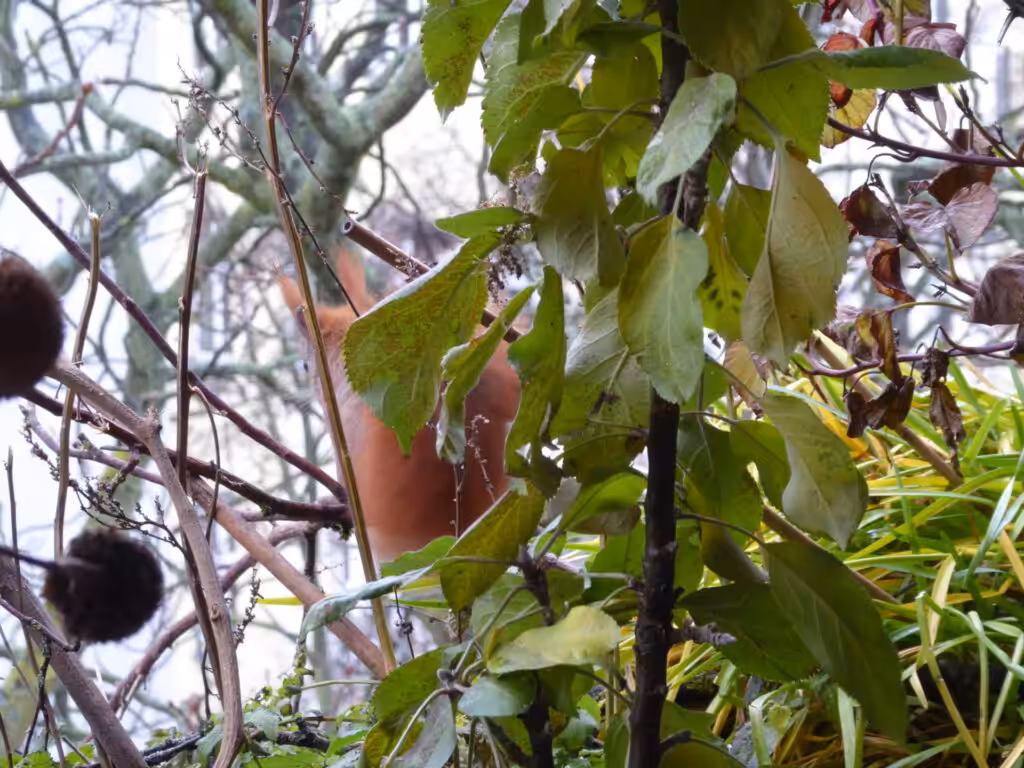 Hier konnte ich wunderbar beobachten, wie es sich getrocknete Pflanzenstängel von Baumspinat, Tomate, Brennnessel und Sonnenblumen abgebissen hat. Gut, dass die bei mir noch in den Balkonkästen herumstehen, eigentlich für die Insekten. Die überwintern gern in den hohlen Pflanzenstängeln. Vögel holen sich vielleicht noch die letzten vorhandenen Samen. Ich hatte mich beim Beobachten total gewundert, was es da macht, dieses Abbeißen kannte ich noch nicht. Da der Kobel ziemlich versteckt liegt und ich zum damaligen Zeitpunkt noch gar nicht dachte, dass hier ein Eichhörnchen schlafen möchte, bin ich überhaupt nicht auf die Idee gekommen, was es vorhat.