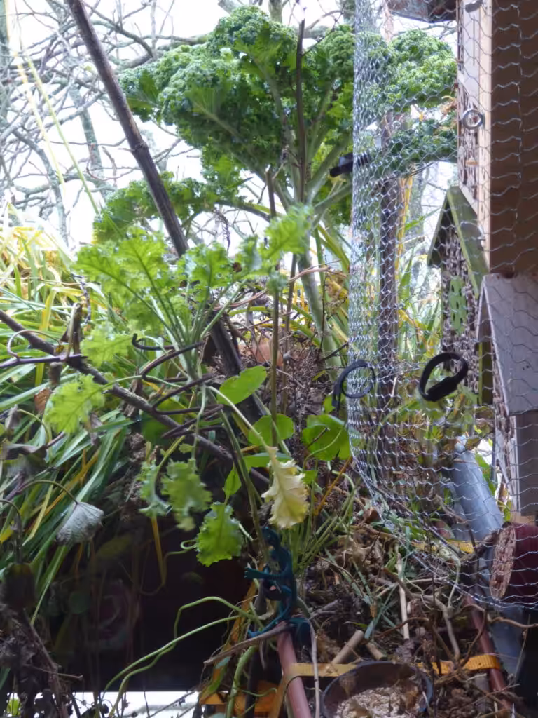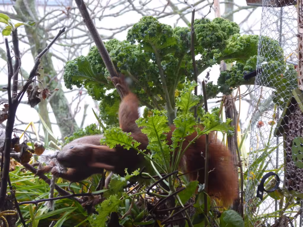 Hier seht Ihr, wie es die Schnur abbeißen will, um damit den zukünftigen Kobel auszupolstern. Es kämpft fast mit dieser Schnur, immer wieder. Es zerrt und zerrt an der Schnur, beißt und beißt immer wieder. An dieser Schnur sind Tomaten und Süßkartoffeln zur Decke hochgerankt. Jetzt im Dezember sind sie als exotische Pflanze, die keine Kälte mag, halt vertrocknet. Der Grünkohl als Wintergemüse dagegen hält Frost bis ‑15° aus und wird den ganzen Winter schön grün ausschauen. Zum Ausruhen klettert es dann mal schnell die Insektennisthilfen hoch. Diese sind mit Kaninchendraht gesichert, weil sich Buntspecht und Meisen gern an der Wildbienenbrut bedienen und die Brutgänge aufpicken, um an das proteinreiche Futter heranzukommen.