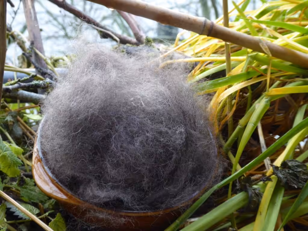 Damit es noch wärmer und kuscheliger im Kobel wird, habe ich ihm zuerst ein altes T‑Shirt zerschnitten und hingelegt. Diese Stückchen hat es auch bald eingebaut. Ideal sind zur Polsterung weiches Heu und Moos. Auch kurze Schafwolle z.B. ein altes Lammfell. Alle Fäden (auch Menschenhaare), die länger als 3 cm sind, wickeln sich gerne mal um die Mini-Füßchen des Nachwuchses. Die müsste man kürzen. Jemand liebes hat mir Wuffls Unterwolle geschickt. Wuffl-Hund heißt Daphne. Danke. Wärmendes, weiches Auspolsterungsmaterial. Wenn sie jetzt nicht von den Hörnchen verwendet werden, wandern sie vielleicht später in einen Vogelnistplatz.