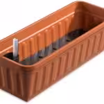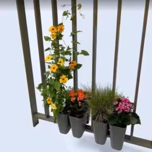 Pflanzgefäße mit Wasserspeicher aus recyceltem Plastik für Brüstungen und Stabgeländer oder Stangengeländer mit vertikalen Streben