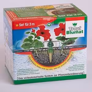 Starterset für die Bewässerung von 3 Balkonkästen. Entweder an die Wasserleitung anschliessen oder über einen Hochtank versorgen, der mindestens 1 m höher steht. Das Gießwasser kommt tropfenweise aus einem Tropfschlauch, der vom Gießkopf des Tropf-Blumat je nach Feuchtigkeitsbedarf der Pflanzen automatisch geöffnet und wieder geschlossen wird. Voraussetzung für diese Fühlerfunktion ist die Wasserbefüllung des Tropf-Blumat einschließlich des porösen Tonkegels. Ohne Computer oder Elektroanschluss!