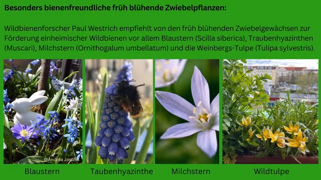 Ich habe einen Anbieter für Dahlien und Frühblüher-Zwiebeln gefunden, der Wert auf Bienenfreundlichkeit und Bio-Produktion legt, es ist nämlich schwierig, Blumenzwiebeln in Bio-Qualität zu bekommen. Wem Bio-Qualität wichtig ist, wird das schon bemerkt haben. Ich habe Natural Bulbs kontaktiert und gefragt, ob unsere große Bio-Balkon Bewegung einen Rabatt bekommen könnte: „Ja! Natürlich. Unsere Blumenzwiebeln sind von guter Qualität und sie sind alle bio-zertifiziert. Liebe Grüsse aus Hillegom/Niederlande.“ Die Bienen lieben vor allem Muscari (bei mir auch), Krokus, Alliums und Hyazinthen.