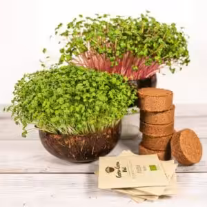 Microgreens (auch bekannt als Mikrogrün, Grünkraut oder Blattgrün) sind junge, essbare Keimpflanzen — supergesund, lecker und in nur 6–12 Tagen erntebereit. Das Junggemüse benötigt nach der Keimung Licht zum Wachsen, deshalb eignet sich am besten ein Platz auf der Fensterbank. Die Grow-Grow Nut ist das erste komplett biologisch abbaubare dekorative Microgreen-Anbauset aus einer robusten Upcycling-Kokosnussschale, Kokoserdeziegeln und leckeren Bio-Saatgutsorten. Das Heimgart funktioniert ganz ohne Erde, zusätzliches Gießen und grünen Daumen. Nur einmal gewässert, sprießen bereits nach wenigen Tagen die ersten Blättchen der jungen Keimpflanzen.