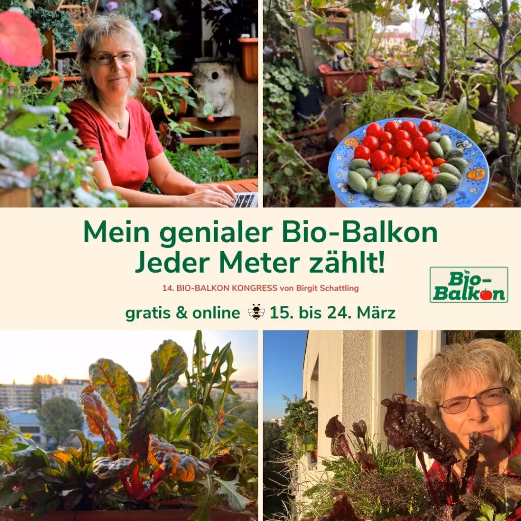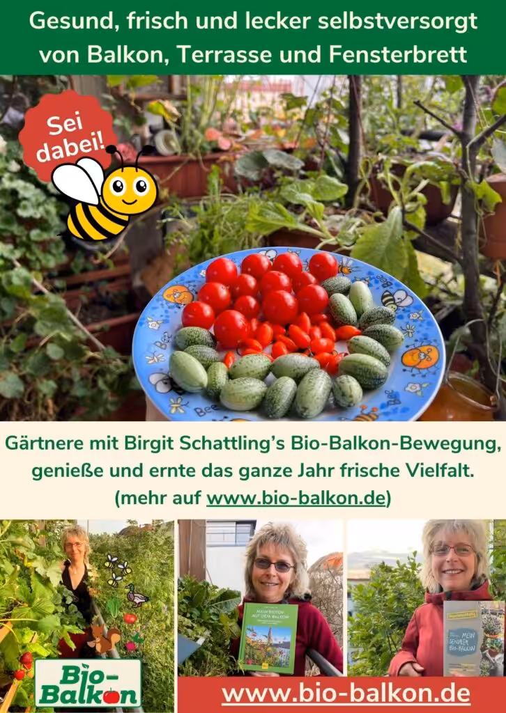 Birgit Schattling ist Balkonbotschafterin aus Berlin und setzt sich mit Leidenschaft für die Nutzung von Balkonen und Fensterbrettern ein. Sie möchte mehr Menschen dazu motivieren, naturnah zu gärtnern und ihre eigenen Oasen der Ruhe und Entspannung zu schaffen. Als hochschulzertifizierte Fachberaterin für Selbstversorgung mit essbaren Wildpflanzen und Jurorin beim Pflanzwettbewerb „Deutschland summt!“ verfügt sie über umfangreiches Wissen und Erfahrung auf dem Gebiet des Bio-Balkongärtnerns.