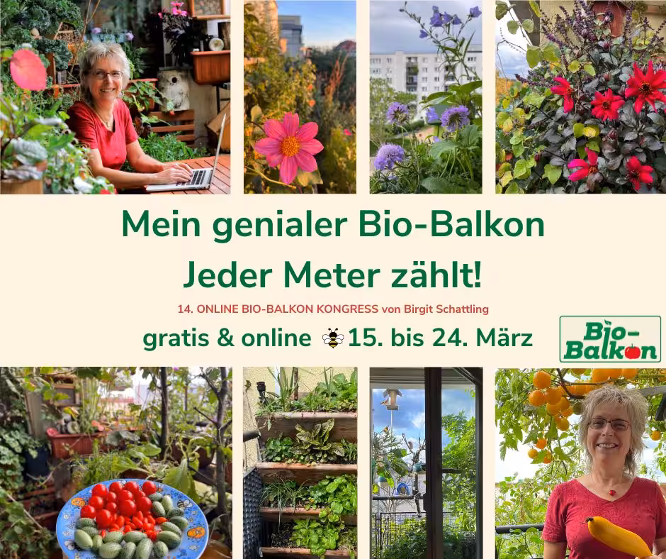 Die Veranstaltung richtet sich an Menschen, die auf begrenztem Platzangebot giftfreies und erntefrisches Gemüse und Kräuter anbauen möchten und dabei die Artenvielfalt fördern wollen. Hier mehr erfahren: https://bio-balkon.de/14-online-bio-balkon-kongress/