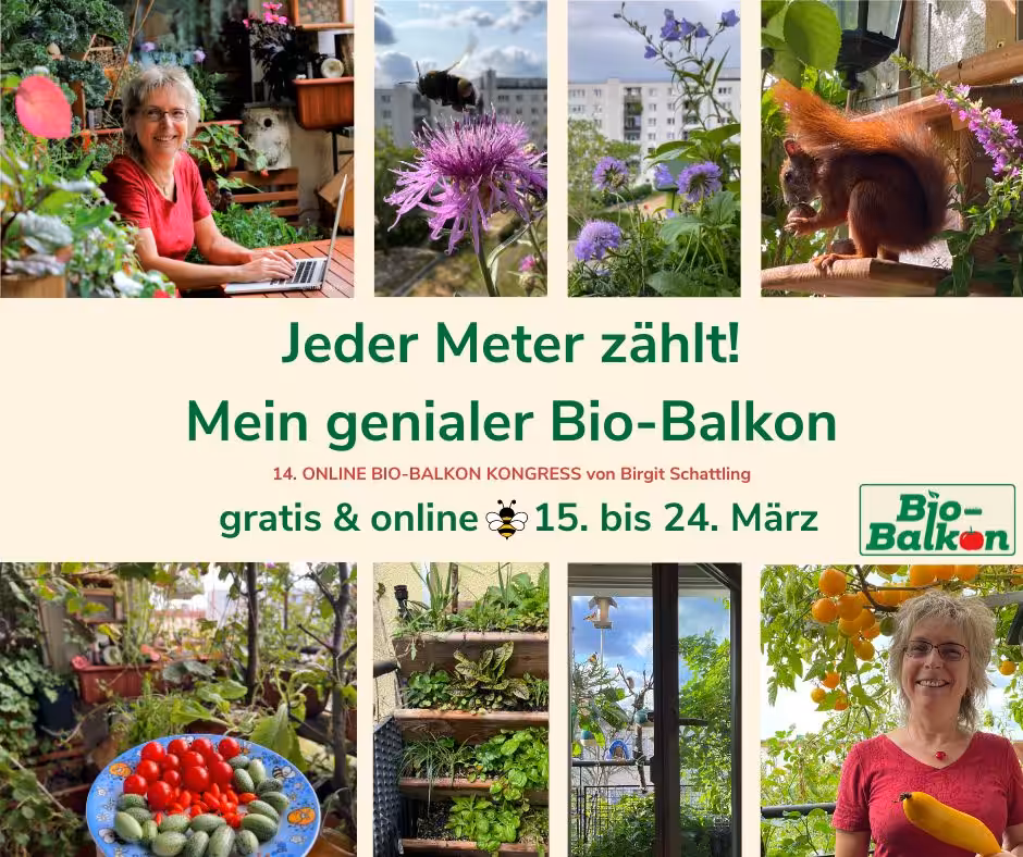 Pressemitteilung Berlin im Februar 2024 – Der 14. Online Bio-Balkon-Kongress findet vom 15. bis 24. März 2024 statt. Unter dem Motto „Mein genialer Bio-Balkon. Jeder Meter zählt“ können Interessierte praktische Tipps und Inspirationen rund um das Thema Selbstversorgung mit Gemüse, Kräutern und Obst auf Balkon, Terrasse oder Fensterbrett entdecken.