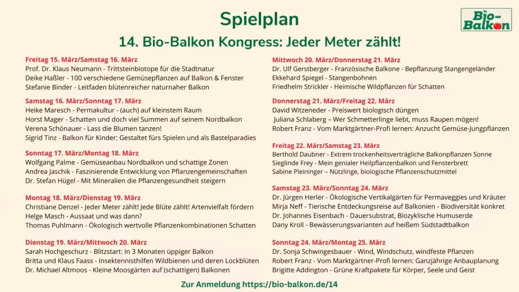 “Bio-Balkon – Gärtnern auf kleinem Raum” ist das Jahresthema der diesjährigen Biogartenmesse. Die Organisatorin der Bio-Balkon-Kongresse Birgit Schattling begleitet die Biogartenmesse https://www.biogartenmesse.de/ an allen fünf Terminen an drei Orten in Deutschland. Mit einem vielseitigen Rahmenprogramm zeigen wir Chancen für kleine, essbare, lebendige, insektenfreundliche Wohlfühlorte mit selbst gezogenem frischem Obst und Gemüse, Kräutern, Blütenzauber, Lebensfreude, Magie und Naturverbindung auf und betrachten in Vorträgen, Workshops und Aktionen die Vielfalt aus ökologischer, künstlerischer und wirtschaftlicher Sicht. Jeder Balkon, Terrasse & Fenster als essbare Wohlfühloase für Mensch und Tier! Ganzjährig vitale Kräuter, Gemüse und Obst ernten und mittendrin sitzend Natur erleben und fördern.