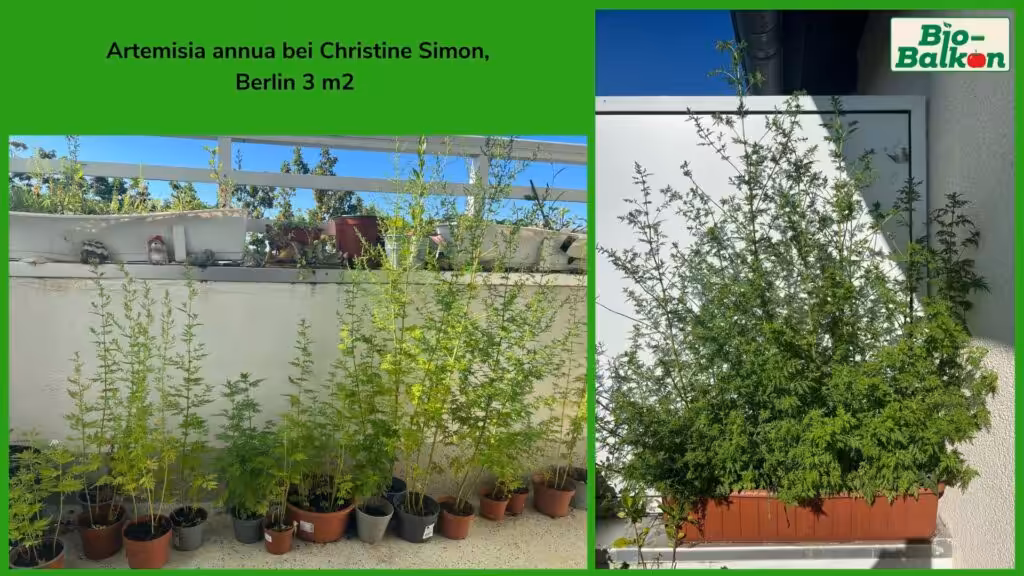 “In ear­ly spring I bought Arte­mi­sia Annua seeds from the Temp­lin herb gar­den orde­red and pre-grown at the win­dow in March. Cul­ti­va­ti­on is a litt­le tri­cky becau­se the seed is as fine as pow­der and you real­ly have to sow it very thin­ly. The sprou­ted seeds are nevert­hel­ess very den­se and quick­ly intert­wi­ne. When the seed­lings were about 5 cm high, I careful­ly sepa­ra­ted them into very small pots. After the Ice Saints, I repot­ted them in lar­ger pots and put 14 plants on the bal­c­o­ny. I could­n’t fit any more on my mini-bal­c­o­ny and unfort­u­na­te­ly I don’t have a gar­den. You have to make sure that the plants don’t dry out, becau­se if they are stres­sed by drought they start to flower. But then the arte­mi­si­nin con­tent drops. I have fer­ti­li­zed them from time to time with liquid uni­ver­sal fer­ti­li­zer Vin­al­ga (Snoek natu­ral pro­ductsThe­re was a lec­tu­re on this at the last orga­nic bal­c­o­ny con­gress). I haven’t had any stress with pests, they don’t seem to like the inten­se scent of the plant. The plant is har­ve­s­ted when the first flower buds appear, befo­re the arte­mi­si­nin con­tent drops. I then cut off the plants and hung them upsi­de down in the room to dry. I then strip­ped off the dried lea­ves and pul­veri­zed them in a blen­der. As my plants were very clo­se tog­e­ther on the bal­c­o­ny in fair­ly small pots, they only grew to a height of around 1.50 m and did­n’t spread out very much. The har­ve­st of 14 plants then only amoun­ted to a total of 50 g when dried 😲😂😂😂. I only used the lea­ves wit­hout the stems. So you can’t say that gro­wing them on the bal­c­o­ny is very wort­hwhile. Nevert­hel­ess, I thought it was gre­at to try it out. If I had a gar­den, I would do it again next year. It’s not worth let­ting a plant flower in order to coll­ect the seeds. Becau­se the seed sup­po­sedly only pro­du­ces the com­mon mug­wort with much less acti­ve ingre­di­ent. Annu­al mug­wort is grown from hybrid seeds. You can pro­pa­ga­te your own plants by cut­tings, which must be kept frost-free indoors in win­ter.” (Note from me: Refers to plants from Ana­medChris­ti­na used this. The seeds of the plants from the Bio­land nur­sery Umbach and from the Urban herb gar­den is seed-resistant. The annu­al Chi­ne­se mug­wort grows from this seed Arte­mi­sia annuanot our nati­ve com­mon mug­wort Arte­mi­sia vul­ga­ris.)