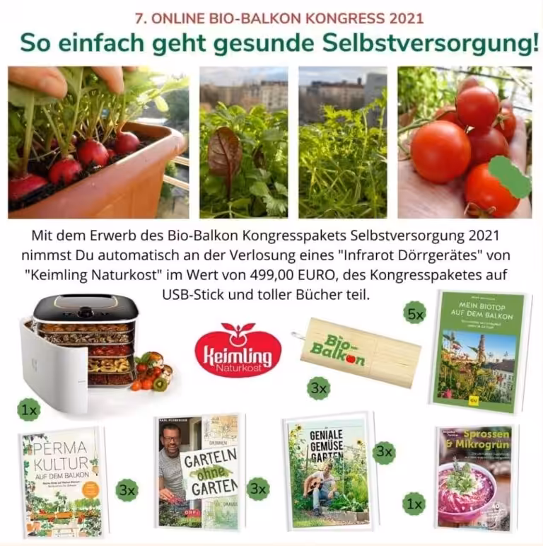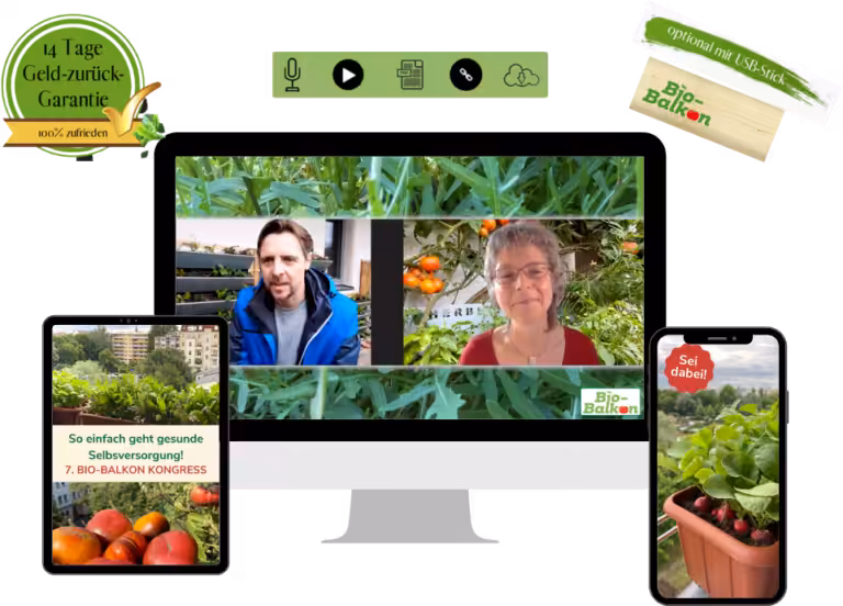 Optional: 50 € Rabatt auf das „Kongress-Paket 2020 vom 4. Online Bio-Balkon Kongress „Mein Biotop auf dem Balkon. Naturerlebnis und Ernteglück mitten in der Stadt“.