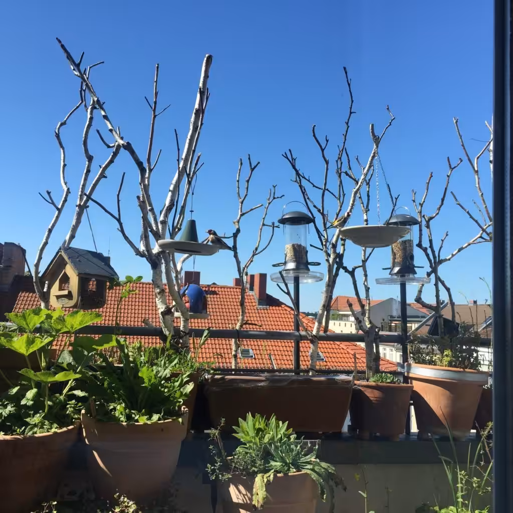 Lilli’s balcony attracts birds — through feeding, water point (clean daily!), vegetation, high branches and letting the seed heads ripen. Can you see the goldfinch in these pictures from mid-April? Birds love to stop off on high branches or branches overhanging the parapet before flying from there to the feeding station. Lilli’s food dispenser are considered particularly hygienic. The food inside is protected from rain and does not become moldy. The drip trays hold some of the falling food. Because even birds are picky and think that the best food is yet to come :).