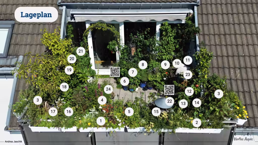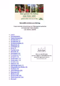 Wer Instagram nicht nutzt, nicht auf seinem Smartphone installiert hat oder ohne Smartphone beschwingt durchs Leben geht, kann die QR-Codes nicht öffnen, die zu den bei NaturaDB hinterlegten Pflanzengemeinschaften führt. Für diejenigen hat Andrea kreativ und schnell ein PDF gebastelt, die zu den bewährten Pflanzengemeinschaften führt. Danke Andrea, dass Du uns Deine langjährigen Erfahrungen auf eine so liebe Art und Weise vermittelst, dass alle auf die Reise zu einem vielfältigen Biotop in Töpfen und Kübeln auf kleinem Raum mitkommen können, die wollen.