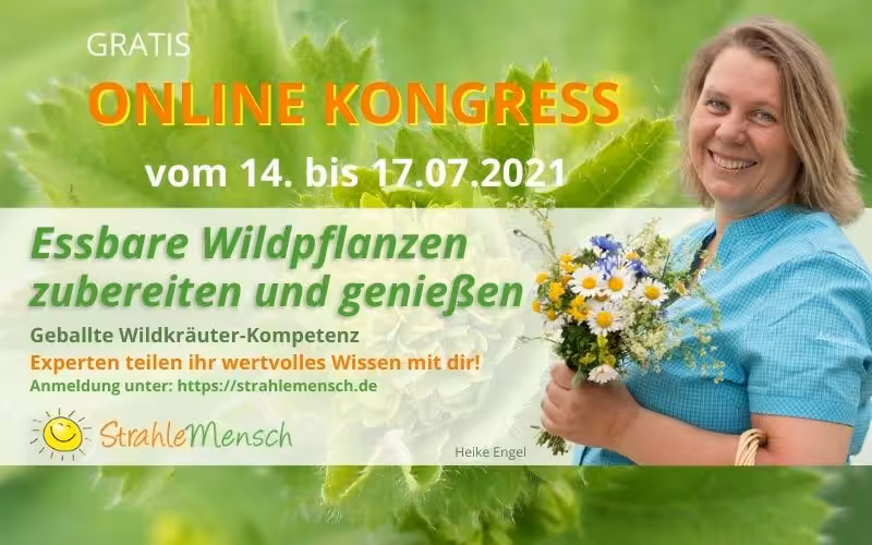 Nun kommt die Fortsetzung: Ab 14. Juli geht es wieder um essbare Wildpflanzen. Der Focus von Heike Engels kostenlosem Online-Kongress ist hauptsächlich auf das Zubereiten & Genießen gerichtet. Wildpflanzen enthalten oft ein Vielfaches an Vitaminen und Mineralstoffen als unsere Lebensmittel, welche wir im Supermarkt, Wochenmarkt oder Biomarkt kaufen können. Z.B. enthält die Brennnessel 30 x mehr Vitamin C als ein Kopfsalat, auch der Mineralstoffgehalt, besonders Kalium und Magnesium, ist in den Wildpflanzen viel höher als im Kulturgemüse. Wildpflanzen passen zu jeder Ernährungsform, egal welche Du praktizierst!