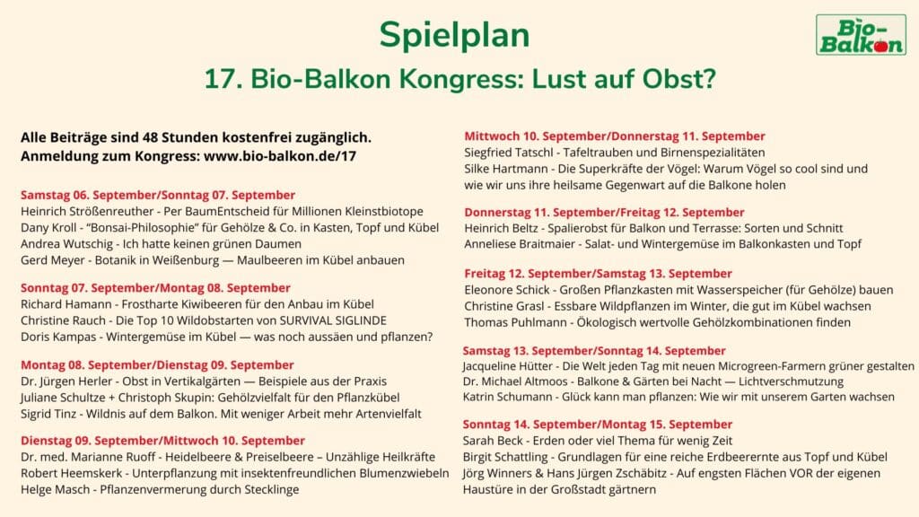 Die Veranstaltung richtet sich an Menschen, die auf begrenztem Platzangebot giftfreies und erntefrisches Obst, Gemüse und Kräuter anbauen und gleichzeitig die Artenvielfalt fördern wollen. Hier mehr erfahren: https://bio-balkon.de/kongresse/kongress-17/ und von den Pionieren der Bio-Balkon-Bewegung lernen. Die Verwendung von Gehölzen im Kübel ist für viele unbekannt, fördert neben der Selbstversorgung enorm Stadtnatur durch Erhöhung der Artenvielfalt. Gehölze sind wichtiger denn je als Klimaanpassung und starker Hebel, das Mikroklima auf dem Balkon zu beeinflussen. Wir können Klima- und Hitzeschutz pflanzen — die Pioniere der Bio-Balkon-Bewegung zeigen es!