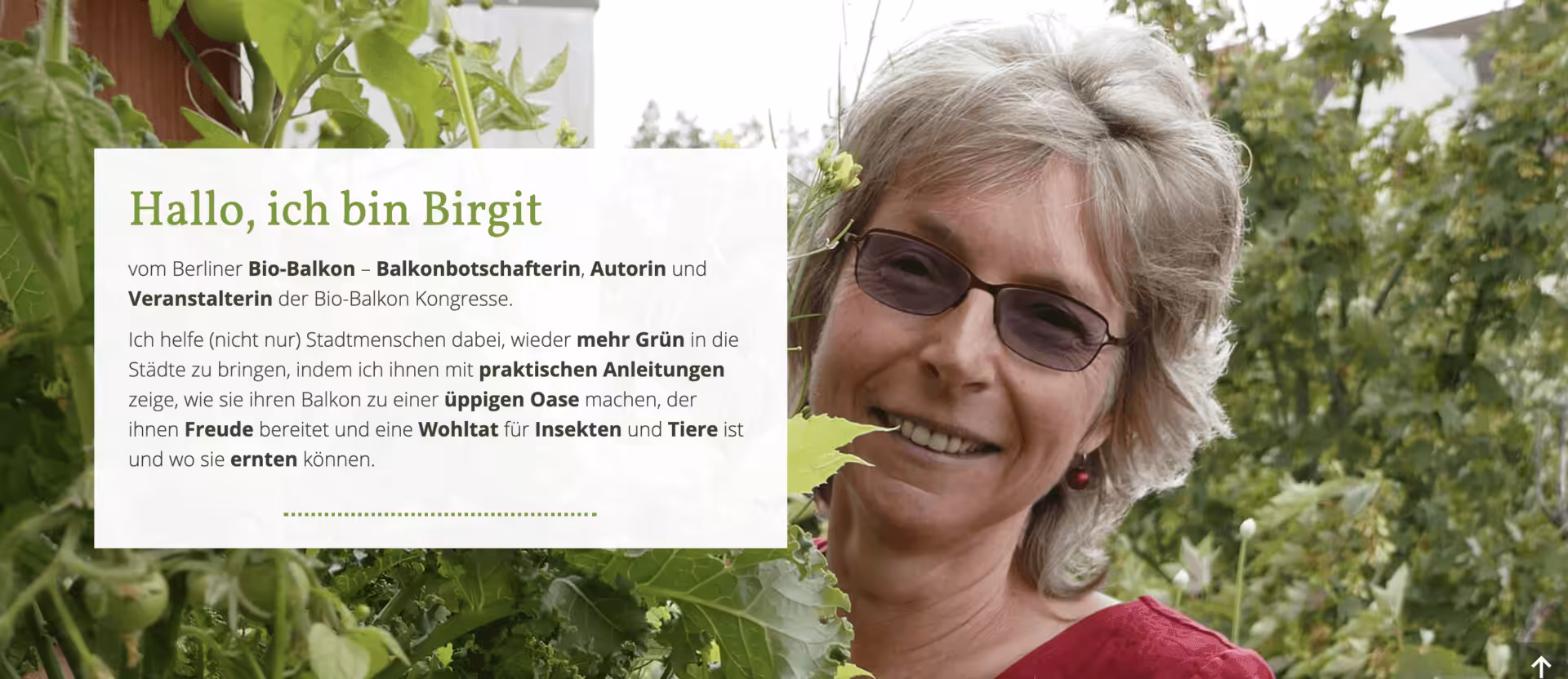 Hallo, ich bin Birgit vom Berliner Bio-Balkon – mehrfach preisgekrönte Balkonbotschafterin aus voller Überzeugung, Autorin und Veranstalterin der Bio-Balkon Kongresse, die jährlich im Frühjahr online und gratis im Internet stattfinden. Ich helfe (nicht nur) Stadtmenschen dabei, wieder mehr Grün in die Städte zu bringen, indem ich ihnen mit praktischen Anleitungen zeige, wie sie ihren Balkon zu einer üppigen Oase machen, der ihnen Freude bereitet, Gesundheit bringt und eine Wohltat für Insekten und Tiere ist und wo sie ernten können.