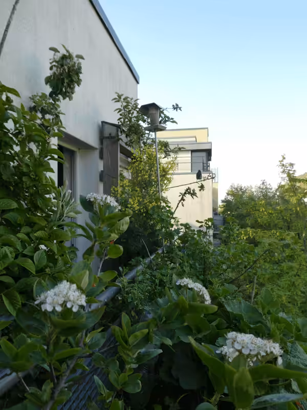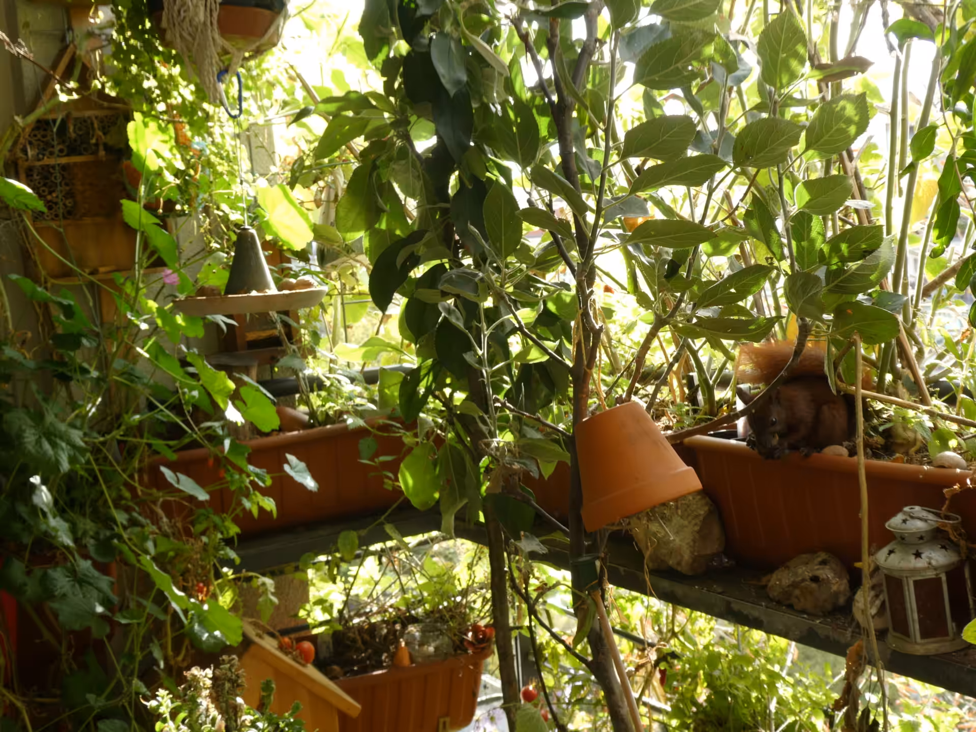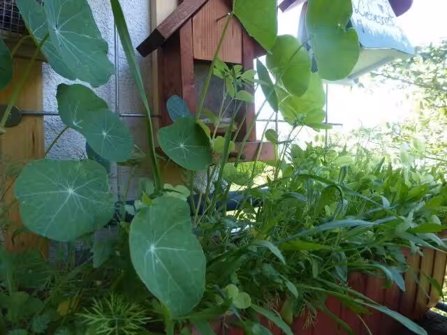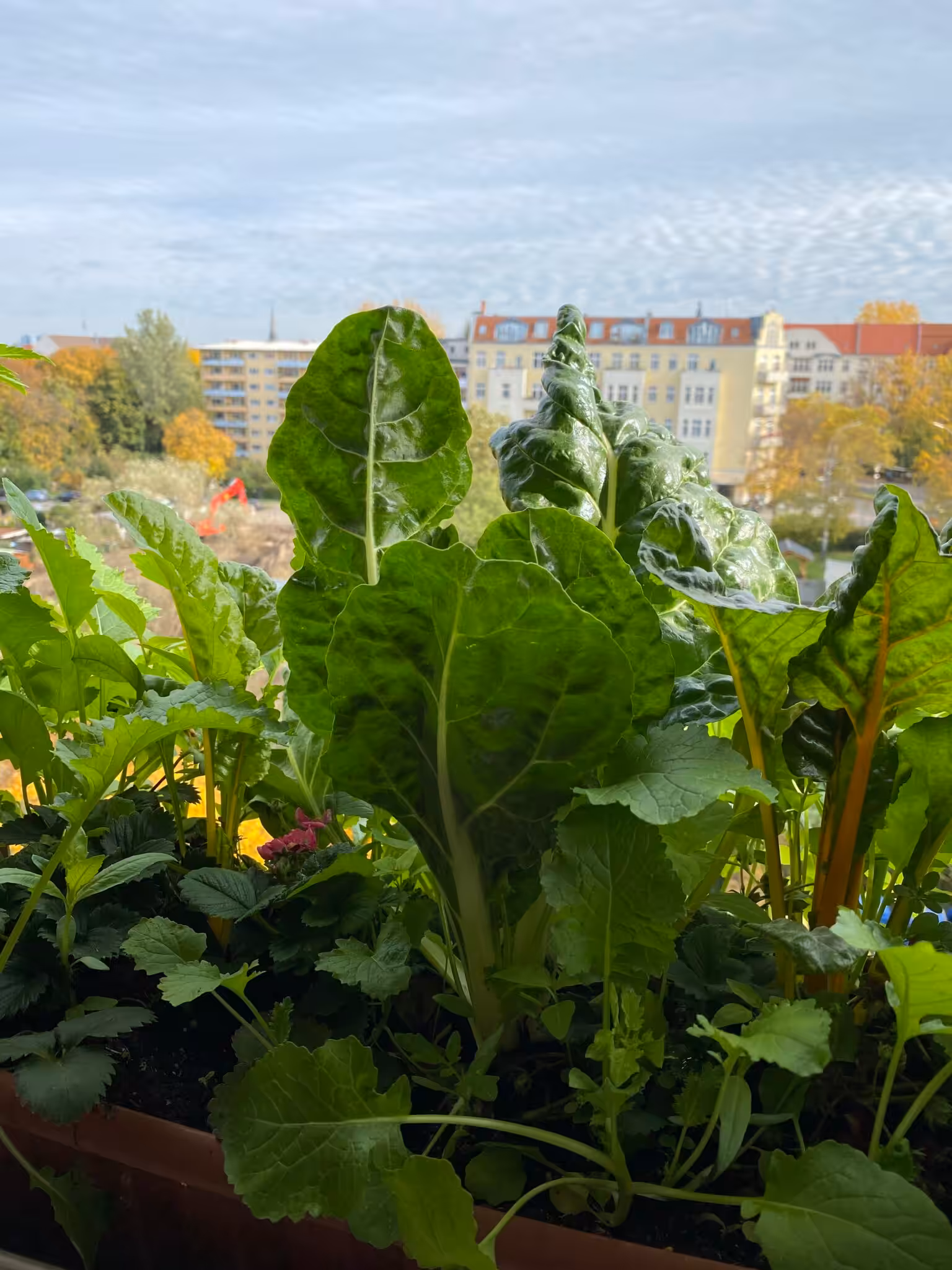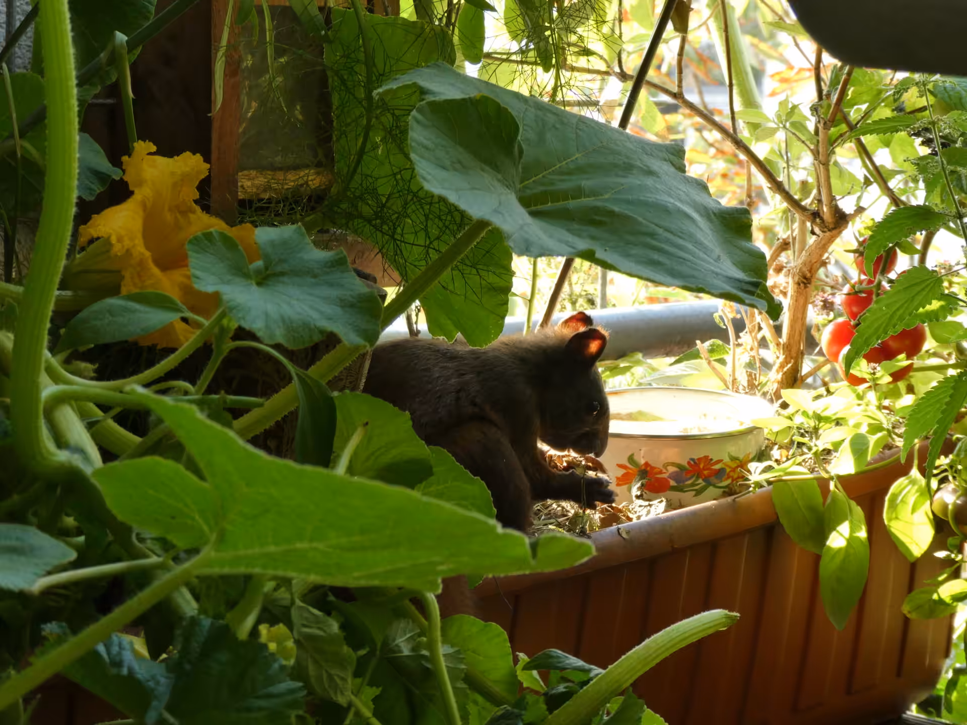 Ein Paradies für die Tiere — Bienen, Vögel, Eichhörnchen. Im Frühjahr 2020 wuchsen wieder 3 junge Eichhörnchen hier auf. Ostermontag 2020 zogen sie überraschend hier ein. Diese fühlen sich vollkommen wohl und okkupierten lange Zeit den Erholungsbalkon. Ich baute das Gärtnern auf dem Fensterbrett aus und bin total begeistert über die weiteren Möglichkeiten. Ende November baute sich ein Eichhörnchen einen weiteren Kobel — auf einem Balkonkasten mit Tomaten auf einem Fensterbrett. Anfang Dezember pflanzte ich nochmals Wintergemüse zum Beweis, wie viel in unseren Städten mit deren Wärmeglocke möglich ist.