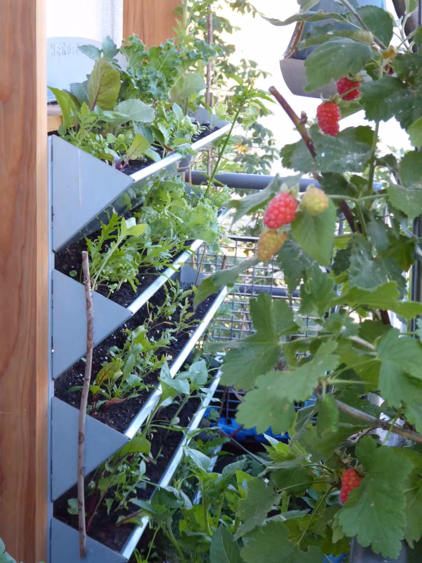 Jürgen Herler von HerbiosGarden stattete den nur 60 cm breiten Naschbalkon mit Vertikalbeeten und automatischer Bewässerung aus. Eine neue Dimension für das Gärtnern in der Stadt. Anbau in sieben Etagen übereinander, mit von oben nach unten durchgehender Erdrückwand mit sehr viel Platz für das Wurzelwerk, nicht verbunden mit der Hauswand.