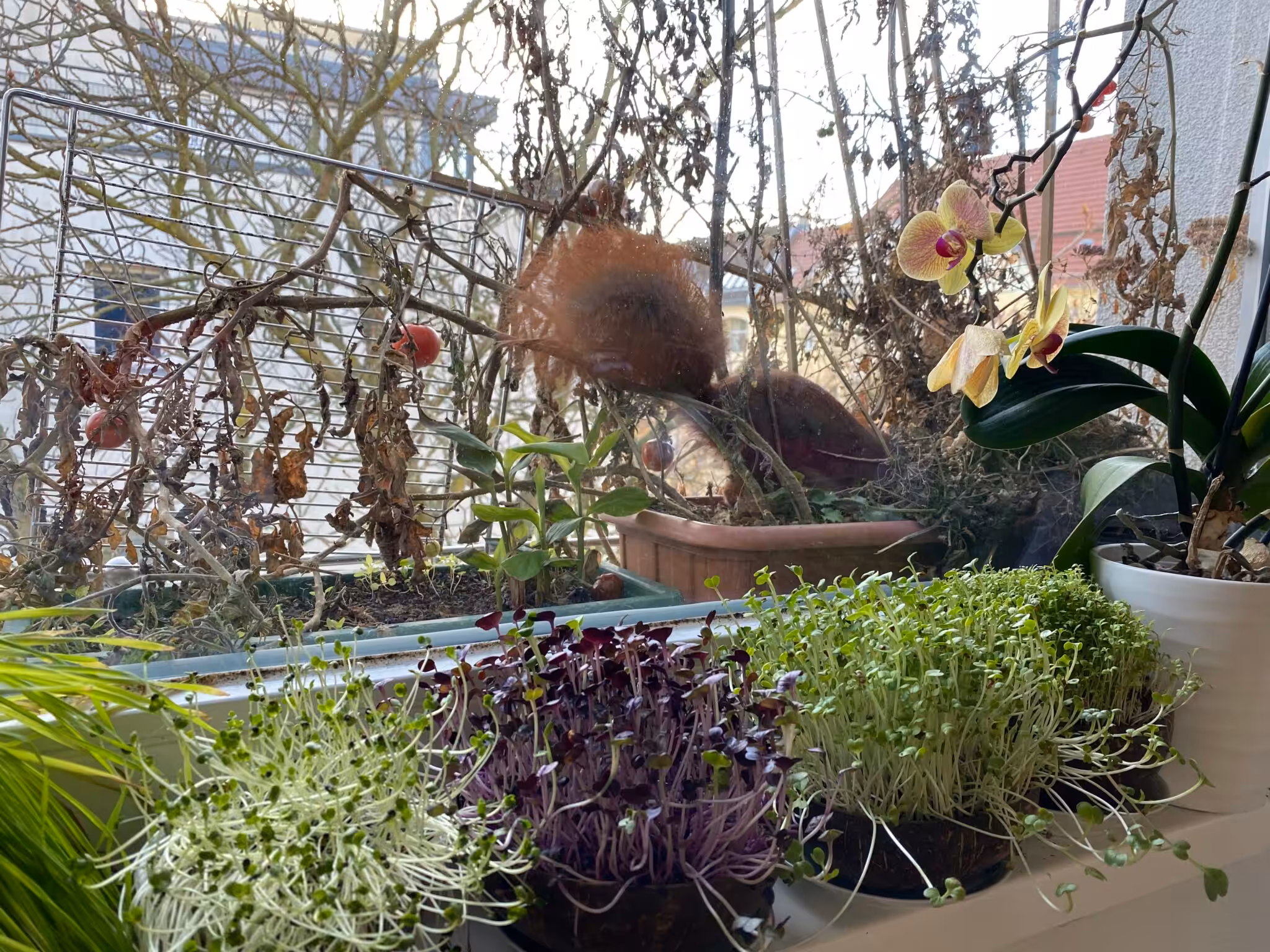 Aufgrund der Eichhörnchen werden die Fensterbretter — neben dem Naschbalkon mit seinen drei Vertikalbeeten — immer intensiver für die Selbstversorgung genutzt.